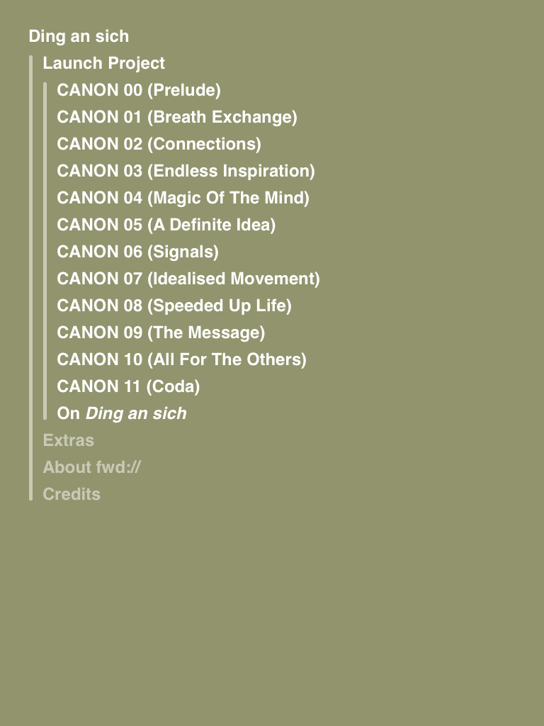 Ding an sich (The Canon Series) is an artwork by Piotr Szyhalski. It consists of a series of 12 “canons,” which respond to the user’s touch to create individual interactive experiences. Together the 12 canons comprise Ding an sich, which translates as “the thing itself,” a philosophical concept defined by Immanuel Kant in his Critique of Pure Reason as “the reality of the thing–the essence beyond the knowledge of appearances.” According to Szyhalski “Ding an sich is unknowable though certainly existing, providing a unique angle for the contemplation of art in general, and specifically the relationships between artists, audiences, and the work itself.”